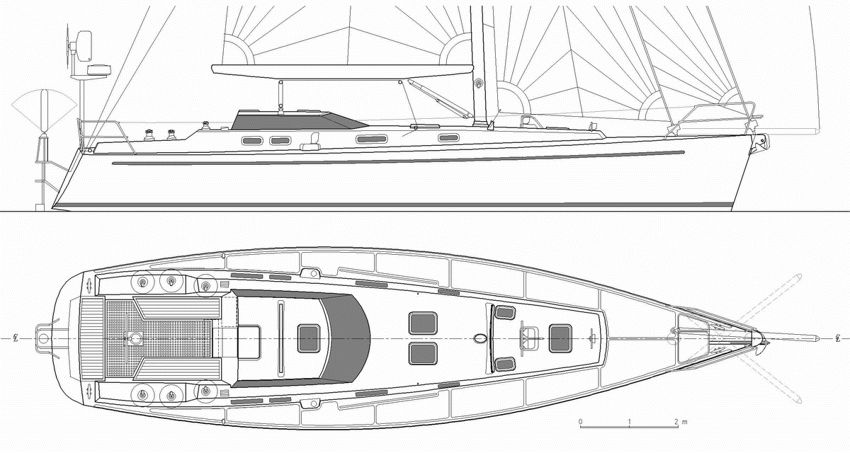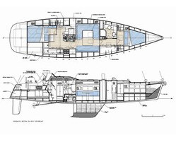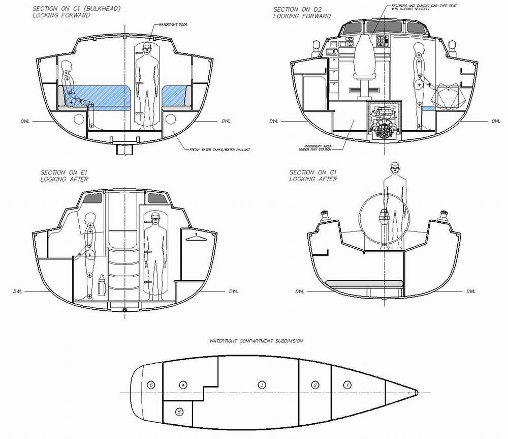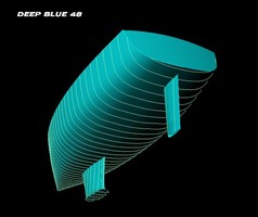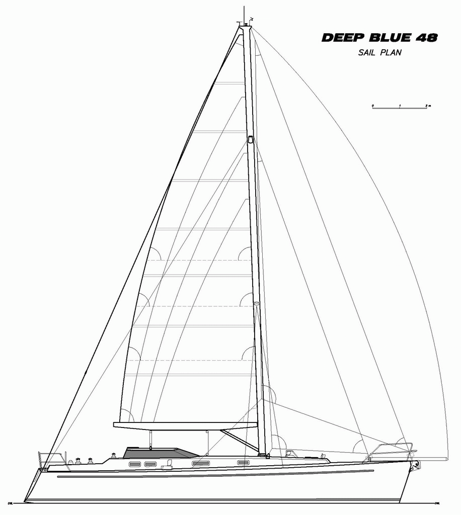 DEEP BLUE 48 DEEP BLUE est un voilier de grand voyage, étudié pour pouvoir être manoeuvré par un équipage de deux personnes. Les aménagements sont conçus pour accueillir quatre personnes pour de longues périodes. Ils comprennent une position de garde intérieure surélevée, avec vue à l'extérieur sur 360°. Sa carène élancée à déplacement léger est capable de garantir de bonnes vitesses avec une surface de voile modérée, plus maniable en équipage réduit. La construction est en bois-époxy selon la technique "strip-planking". Les échantillonnage de coque et de structure répondent aux critères exigeants du American Bureau of Shipping. Le volume interne est subdivisé en six compartiments étanches pour une sécurité accrue en cas de collision en haut mer. Les 700 litres d'eau douce peuvent être transférés d'un coté à l'autre comme ballast de manière à limiter la gîte. Les réservoirs sont maintenus pleins par un dessalinisateur. Le bateau est gréé en cotre, la configuration la plus versatile dans les différentes conditions météorologiques. La trinquette est autovirante pour faciliter la manœuvre par vent frais. Pour télécharger un document pdf avec une description et une discussion de ce je projet (en anglais), cliquez ici.